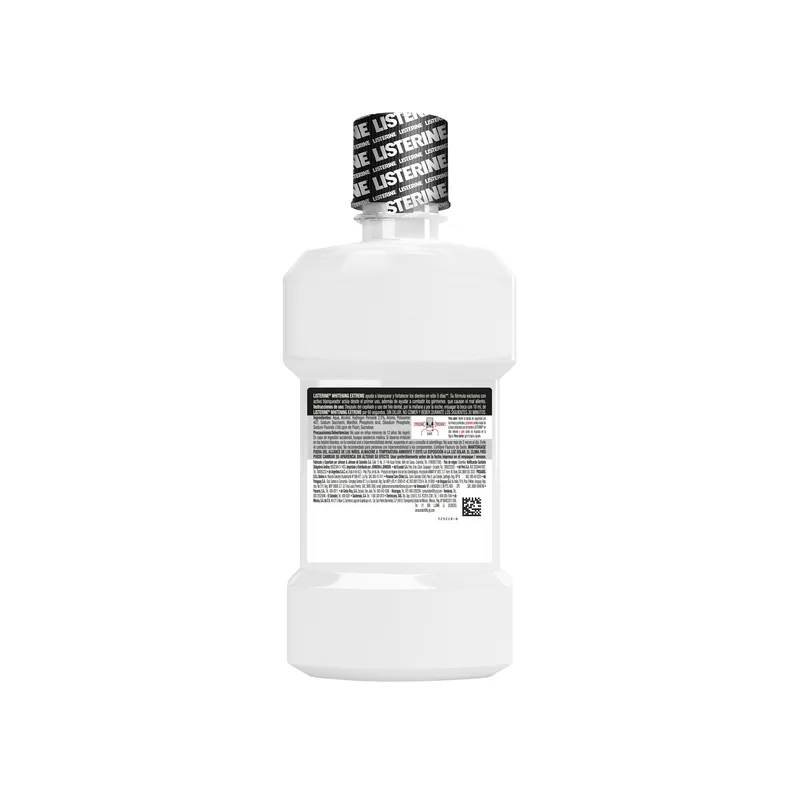 Enjuague Bucal Listerine Whitening Extreme en presentación de 236 ml. Es un enjuague bucal que ayuda a eliminar el mal aliento, la placa y el sarro. Asimismo, evita el surgimiento de caries y fortalece el esmalte dental. Se encuentra compuesto de ácido benzoico, eucaliptol, cloruro de zinc, salicilato de metilo, sacarina sódica, benzoato de sodio, floruro de sodio y mentol. Es fabricado por la empresa Johnson & Johnson. La imagen que se muestra es de carácter ilustrativo, por lo que el producto puede variar.