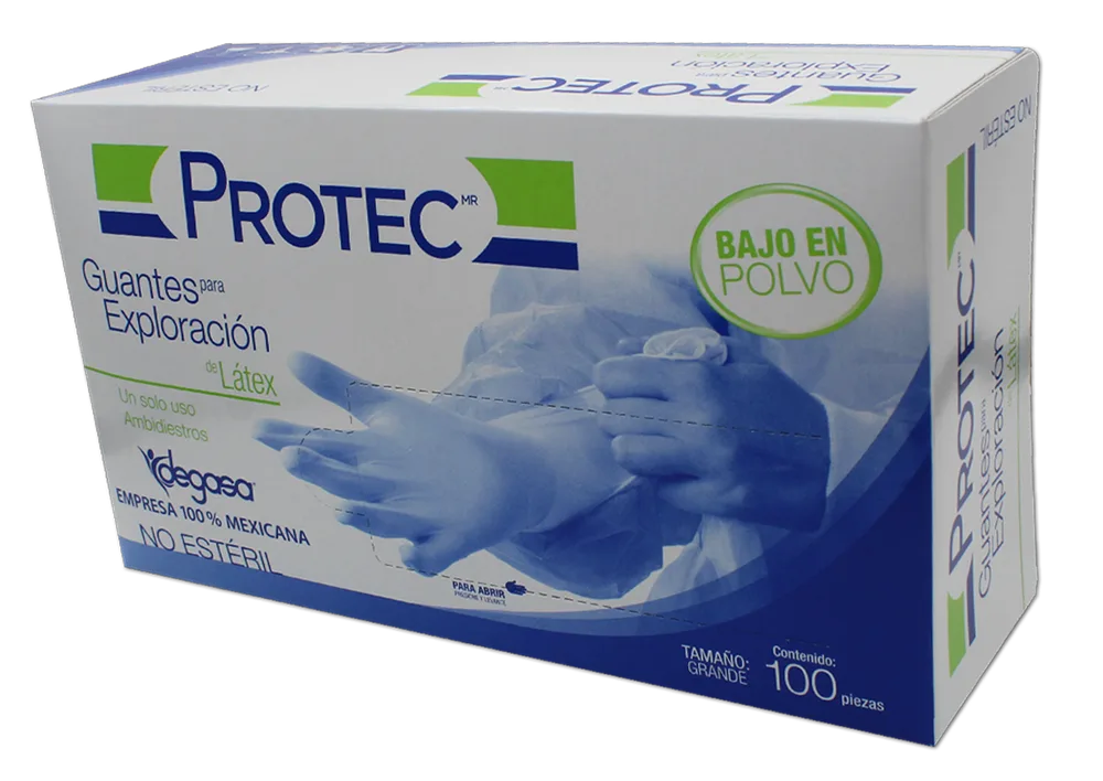 Protec guantes para exploración de látex no estéril tamaño grande. Son guantes para la protección contra agentes externos, ya sean fluidos, piel o mucosas que pueden presentar riesgo de algún contagio, además de proteger contra objetos sucios o que pueden presentar riesgos de contagio. Presentación en caja con 100 guantes de látex talla grande. Elaborado por los laboratorios Degasa. La imagen que se muestra es de carácter ilustrativo, por lo que el producto puede variar.