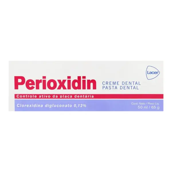 Perioxidin, Pasta Dental. La crema dental Perioxidin, funciona como un antiséptico que se adhiere a la encía indicado para contrarrestar los problemas que trae consigo la formación de placa dentobacteriana, como la gingivitis, ya que impide la reproducción de nuevas bacterias. Presentación en caja con tubo de 50 ml de gel. Está compuesto por 0.12% de Clorhexidina digluconato, Pantenol, Vitamina E y Xylitol. Fabricado por los laboratorios Lacer. La imagen que se muestra es de carácter ilustrativo, por lo que el producto puede variar.